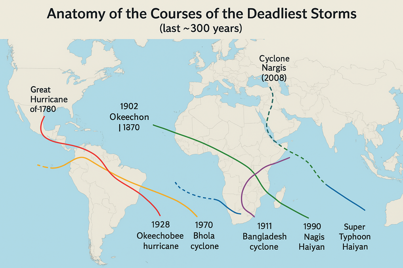 This essay reviews the courses (tracks) and anatomy of some of the deadliest storms worldwide from roughly 1725–2025: how they formed, how and why they followed the tracks they did, why they caused such catastrophic loss of life, and what patterns (ocean basins, steering flows, coastal geography, tide timing, human vulnerability) repeat across events. I focus on representative, well-documented disasters (the Great Hurricane of 1780, the 1900 Galveston hurricane, the 1928 Okeechobee hurricane, the major Bay-of-Bengal cyclones including Bhola 1970 and the 1991 cyclone, Cyclone Nargis 2008, and Super Typhoon Haiyan 2013) and draw broader lessons about storm courses and fatal outcomes.