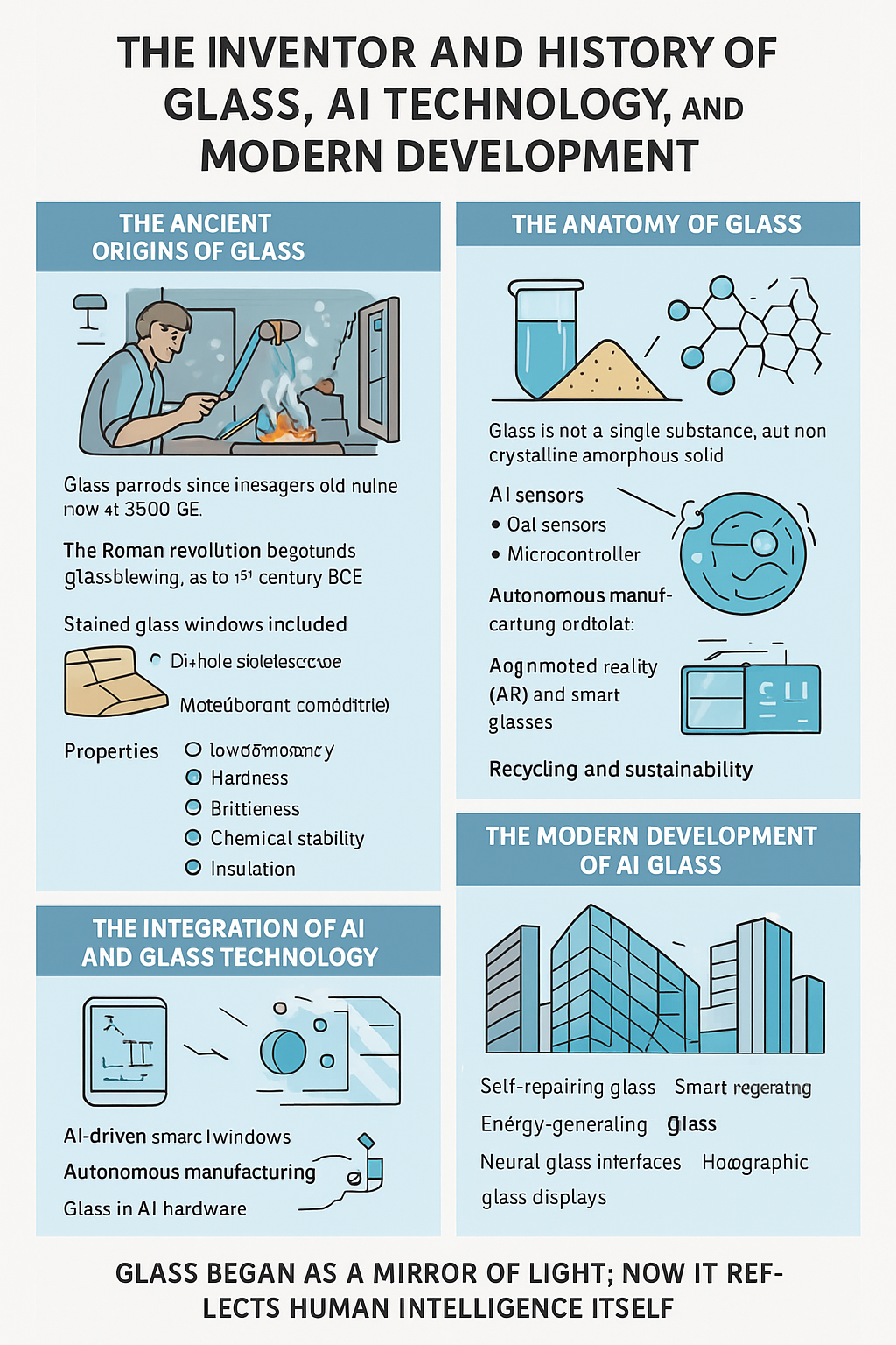 Glass and artificial intelligence, separated by millennia, share surprising parallels. Both emerged from accidental discoveries and evolved through centuries or decades of incremental innovation punctuated by revolutionary breakthroughs. Both transformed from luxury rarities to ubiquitous essentials. Both enable capabilities previously unimaginable, yet both face ongoing challenges and limitations.