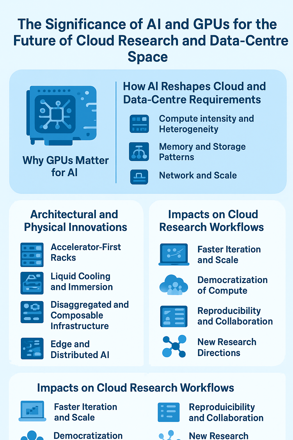 Artificial intelligence (AI) and the graphics processing units (GPUs) that power it are redefining what clouds and data centres do, how they’re built, and why they matter. Once a niche for graphics and batch scientific computing, GPUs are now the workhorse for modern machine learning (ML) training and inference. Combined with software innovations and changing workloads, AI+GPU is reshaping every layer of the cloud and data-centre stack — from chips and racks to power, cooling, networking, and business models. This essay explains the technical drivers, architectural implications, operational impacts, and strategic opportunities that AI and GPUs bring to future cloud research and data-centre design.
